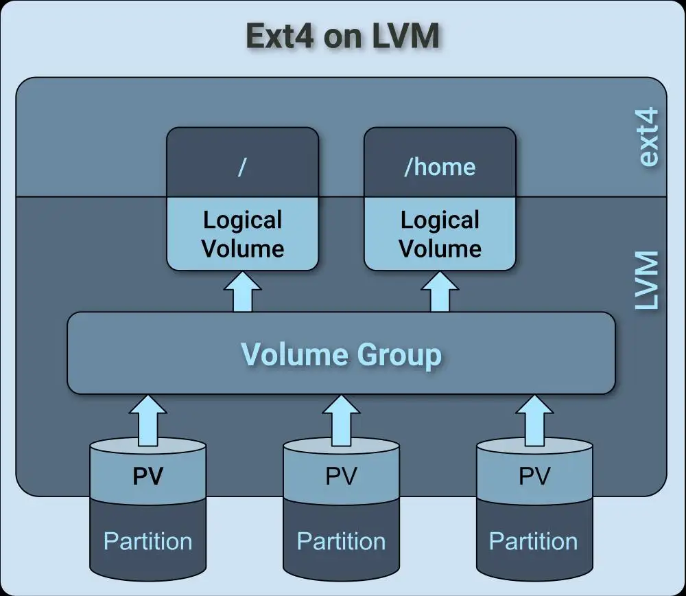 LVM-ext4 环境中的大多数高级功能都来自 LVM 本身。LVM 位于文件系统的“下方”,这意味着它支持任何文件系统。 *逻辑卷(Logical volume)*(LV)是通用的块设备,因此 虚拟机可以直接使用它们。这种灵活性使得每个逻辑卷都可以使用合适的文件系统,用合适的选项应对各种情况。这种分层方法还遵循了“小工具协同工作”的 Unix 哲学。
