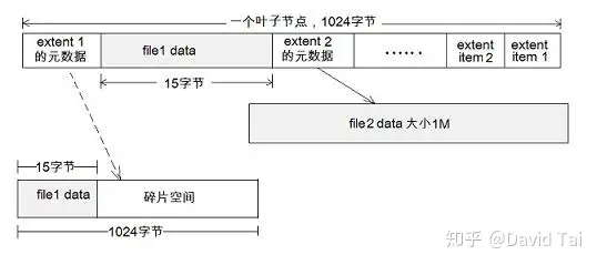 而对于 file1, btrfs 会把其文件内容内嵌到元数据 extent1 中。如果不采用 inline file 技术。如虚线所示,extent1 指向一个最小的 extent,即一个 block,但 file1 有 15 个字节,其余的空间便成为了碎片空间。