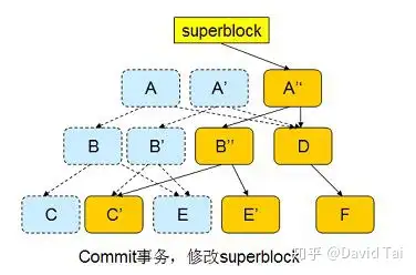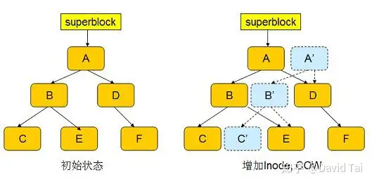 A 是 FS Tree 的根节点,新的 inode 的信息将被插入节点 C 。首先,btrfs 将 inode 插入一个新分配的 block C ’中,并修改上层节点 B,使其指向新的 block C ’;修改 B 也将引发 COW,以此类推,引发一个连锁反应,直到最顶层的 Root A 。当整个过程结束后,新节点 A ’变成了 FS Tree 的根。但此时事务并未结束,superblock 依然指向 A 。