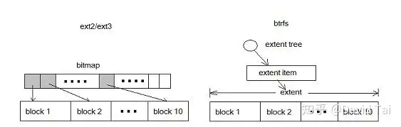 在 ext2/3 中,10 个 block 需要 10 个 bit 来表示;在 btrfs 中则只需要一个元数据。对于大文件,extent 表现出了更加优异的管理性能。