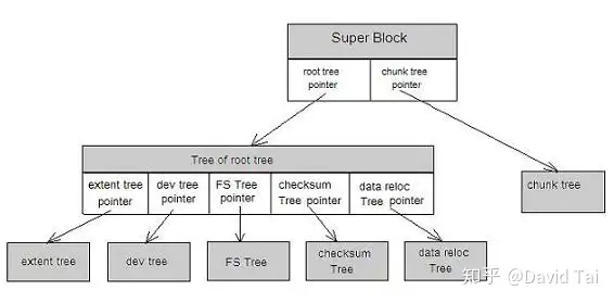 FS Tree 管理文件相关的元数据,如 inode,dir 等; Chunk tree 管理设备,每一个磁盘设备都在 Chunk Tree 中有一个 item ; Extent Tree 管理磁盘空间分配,btrfs 每分配一段磁盘空间,便将该磁盘空间的信息插入到 Extent tree 。查询 Extent Tree 将得到空闲的磁盘空间信息; Tree of tree root 保存很多 BTree 的根节点。比如用户每建立一个快照,btrfs 便会创建一个 FS Tree 。为了管理所有的树,btrfs 采用 Tree of tree root 来保存所有树的根节点; checksum Tree 保存数据块的校验和。